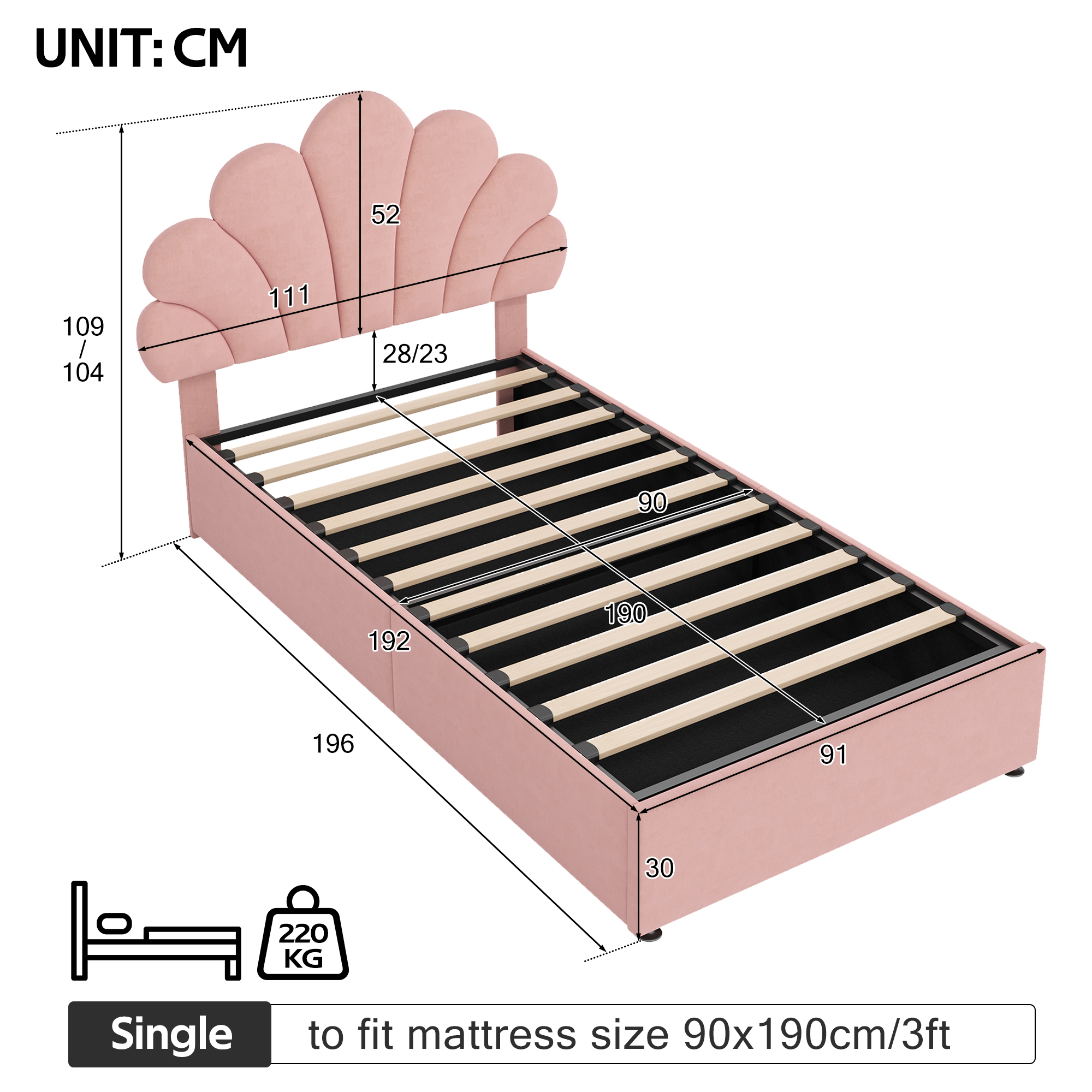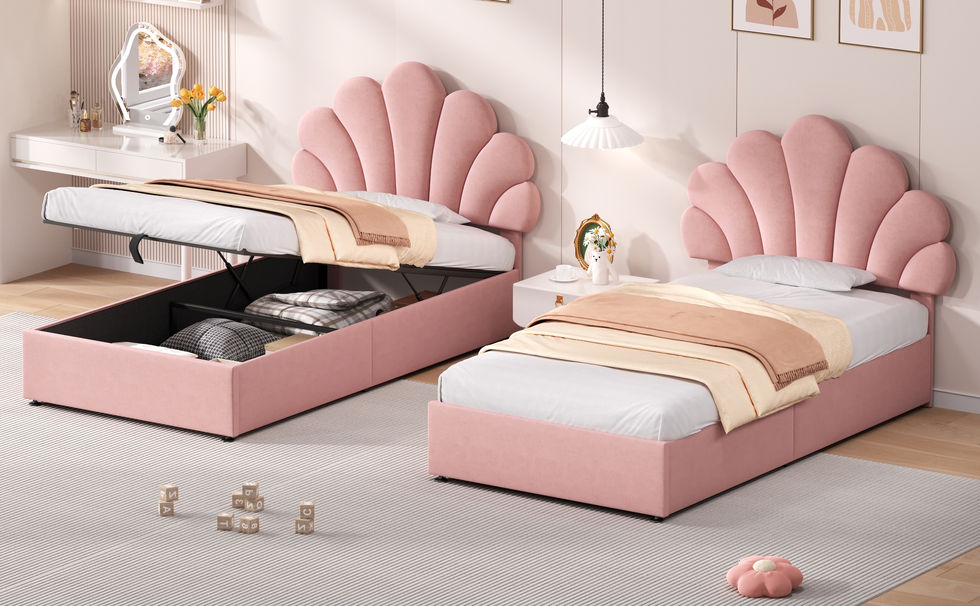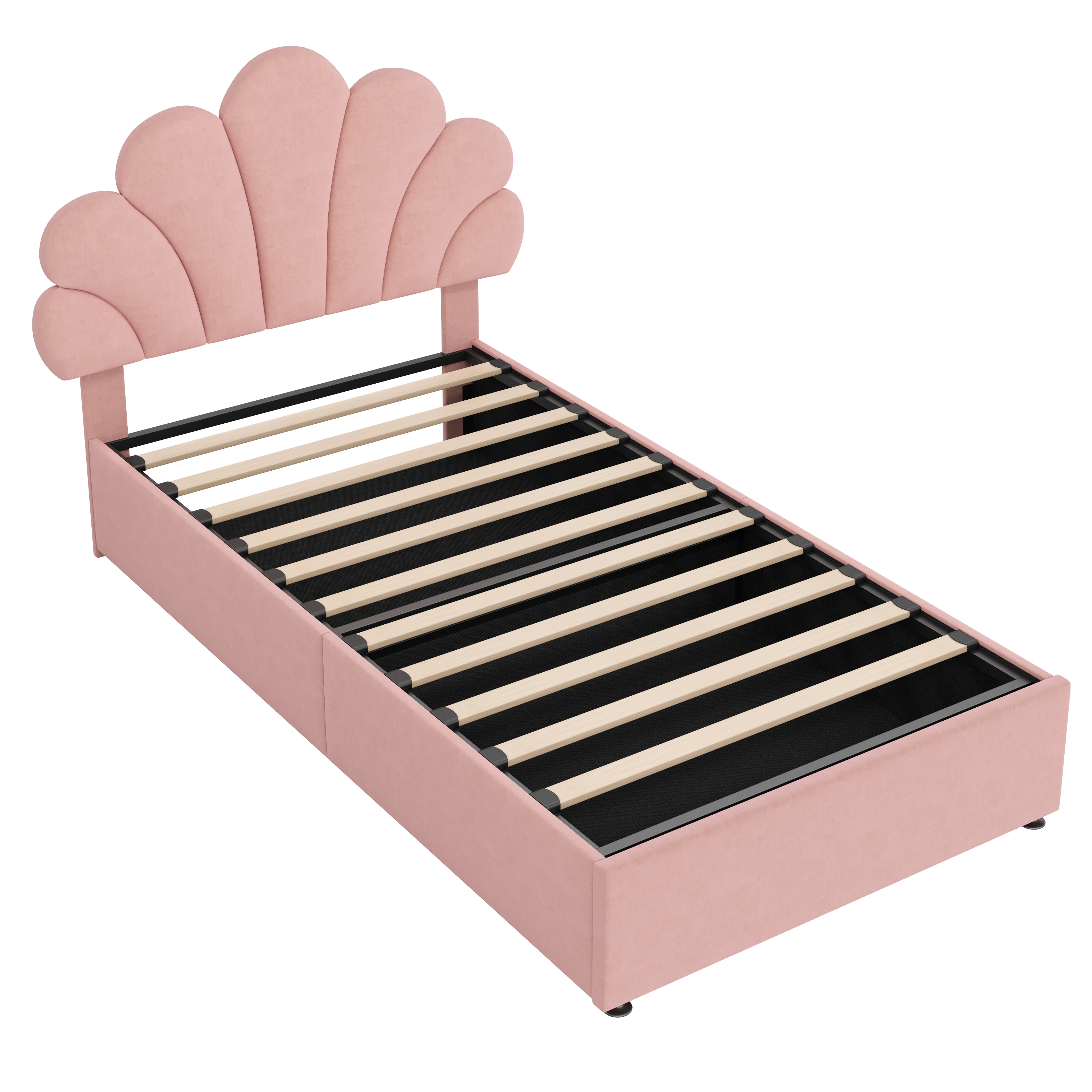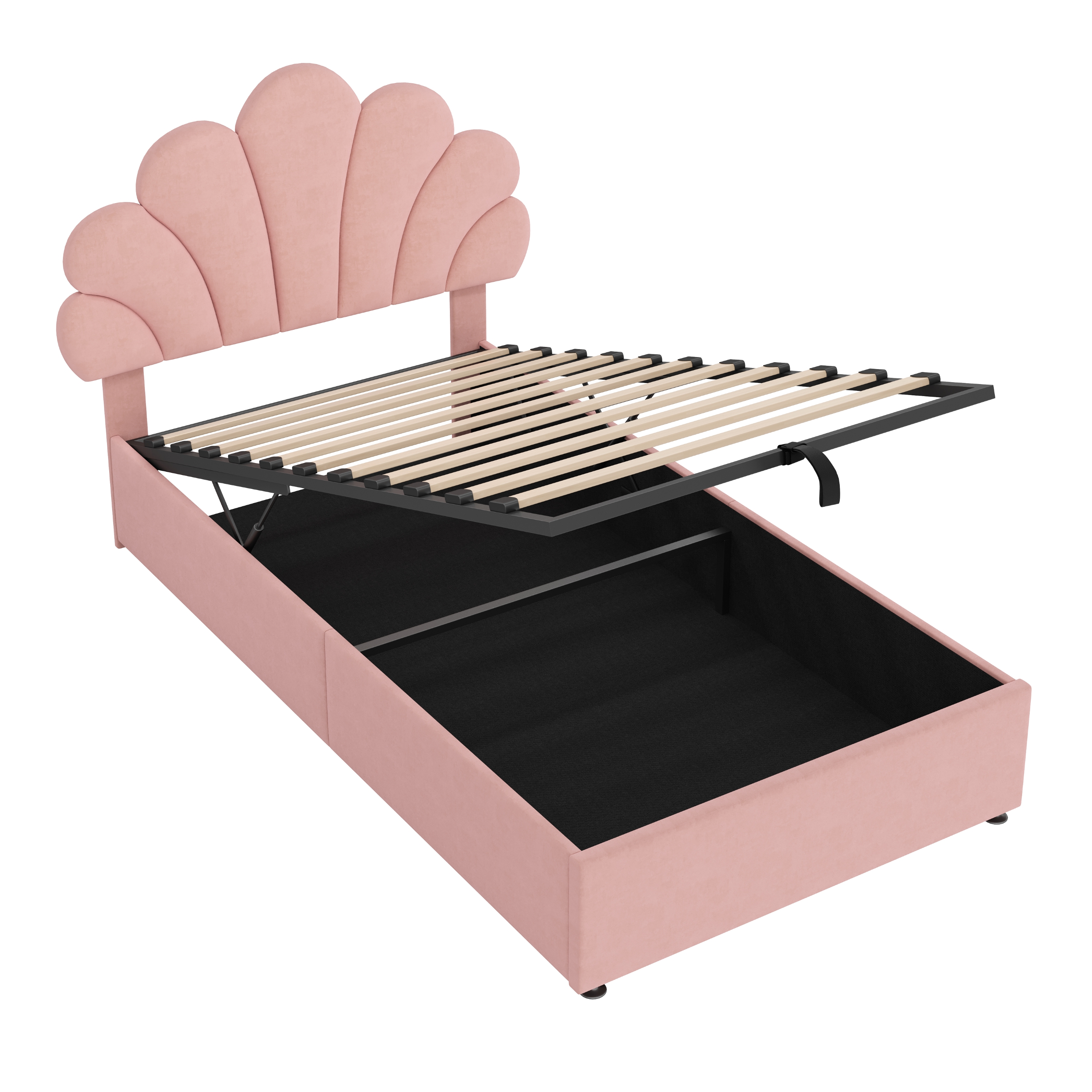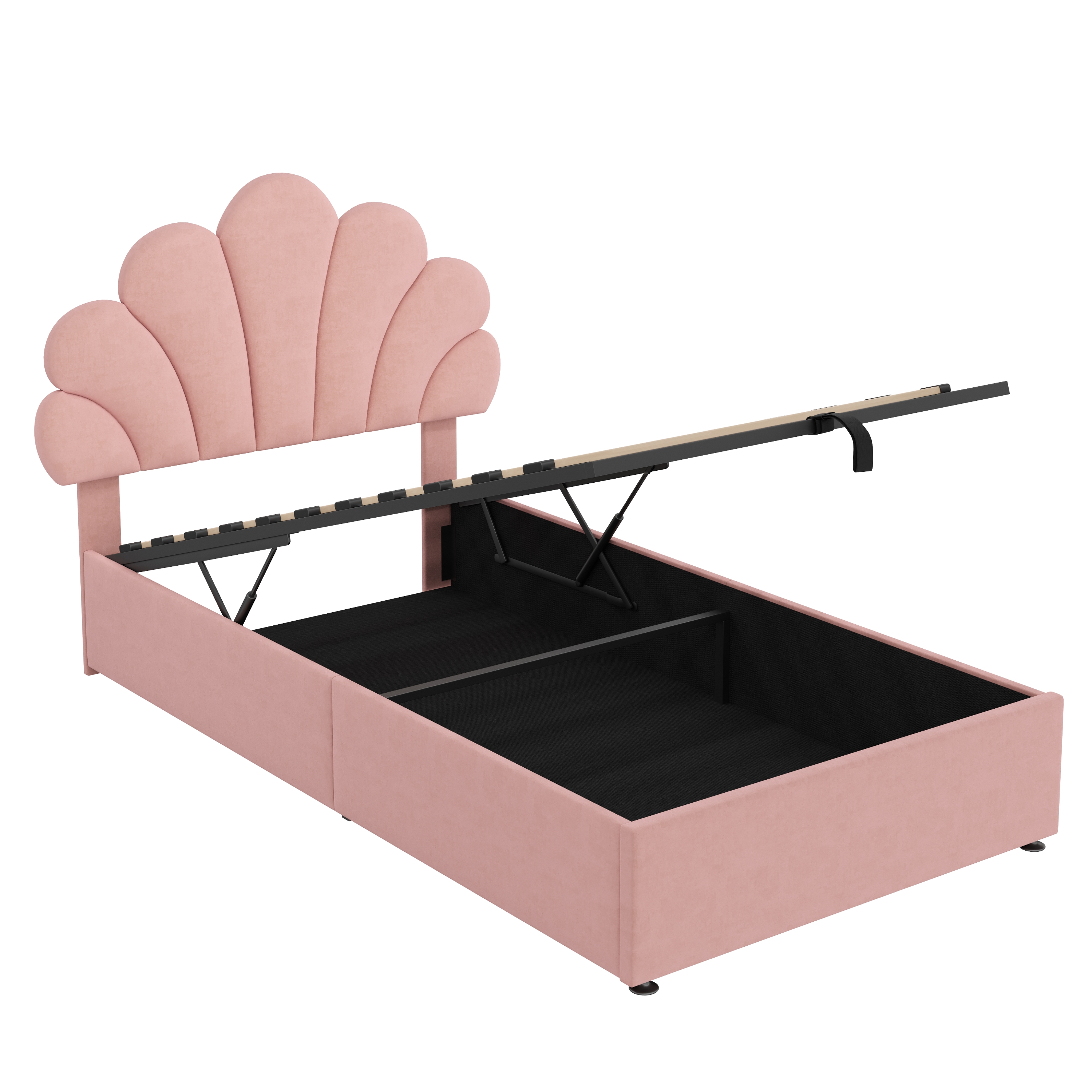 Product Name:3ft Single Upholstered Hydraulic Bed with Adjustable Chic Petal Headboard, Soft Velvet Bed Frame with Hydraulic Storage, Petal Bed with Solid Wood Slat, No Box Spring Needed, Pink (No Mattress)