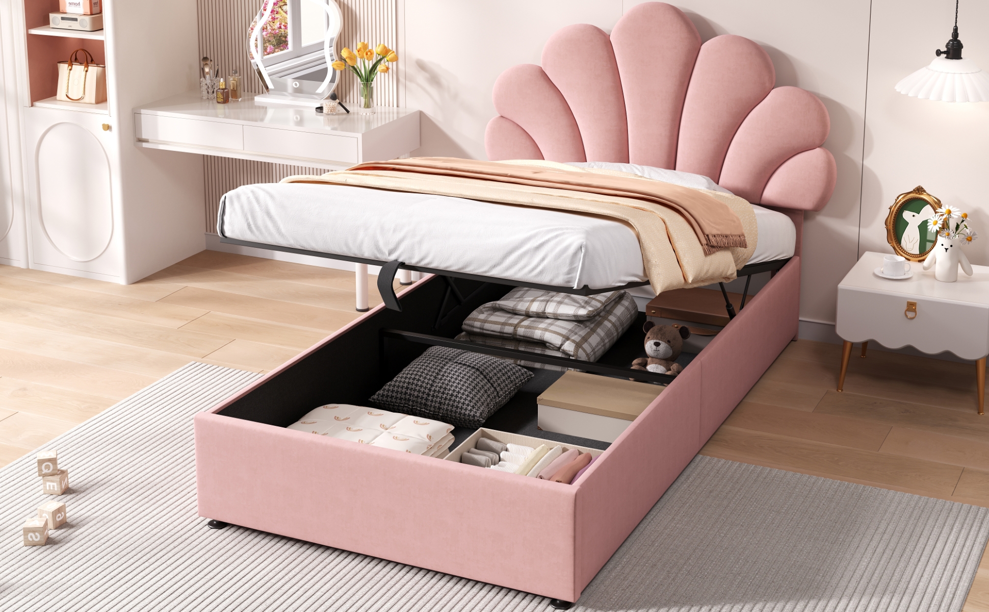 Velvet Petal Upholstered Bed with Hydraulic Storage