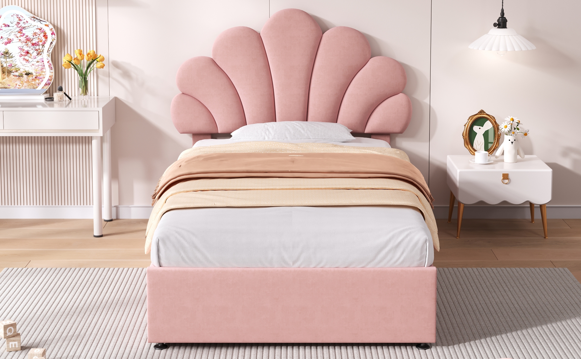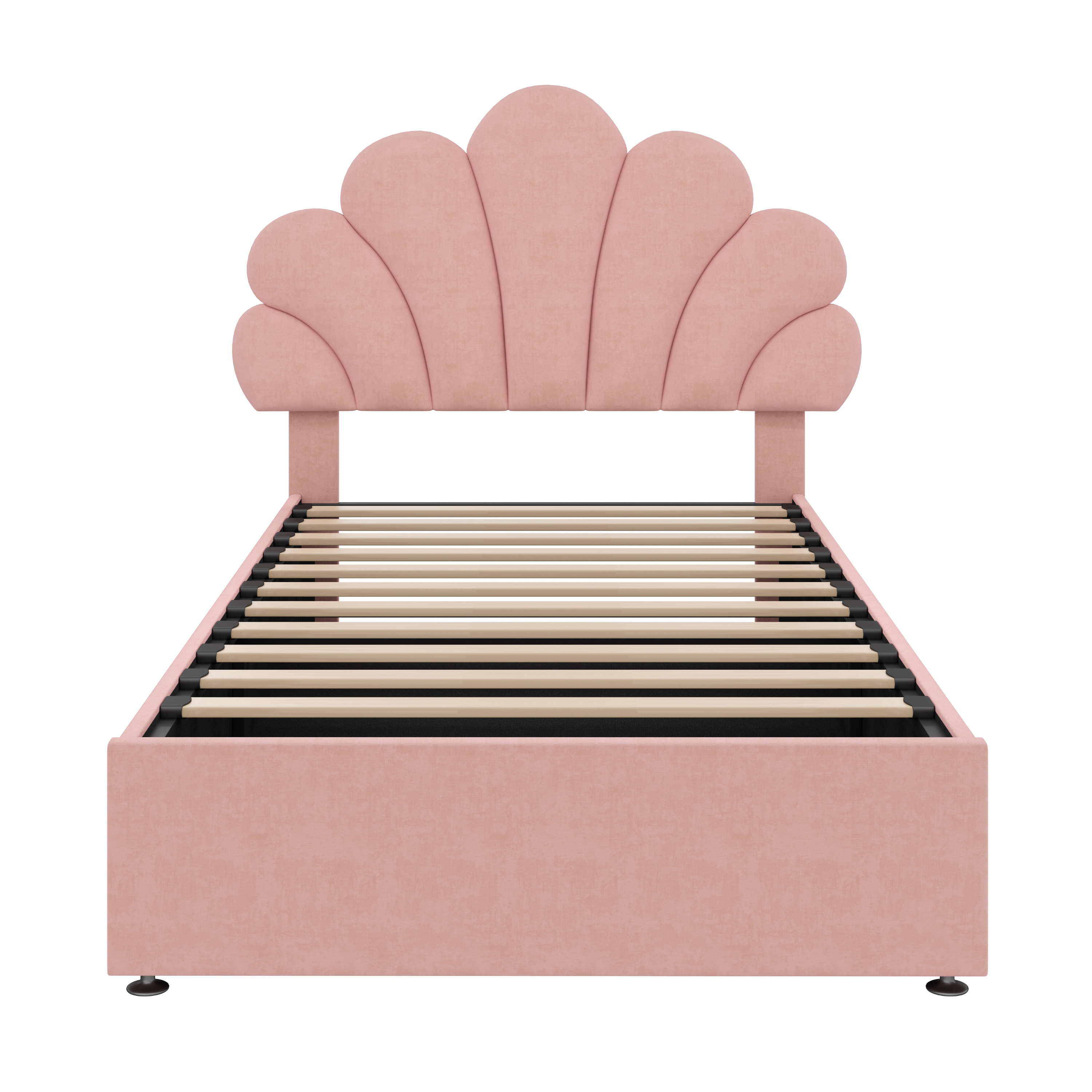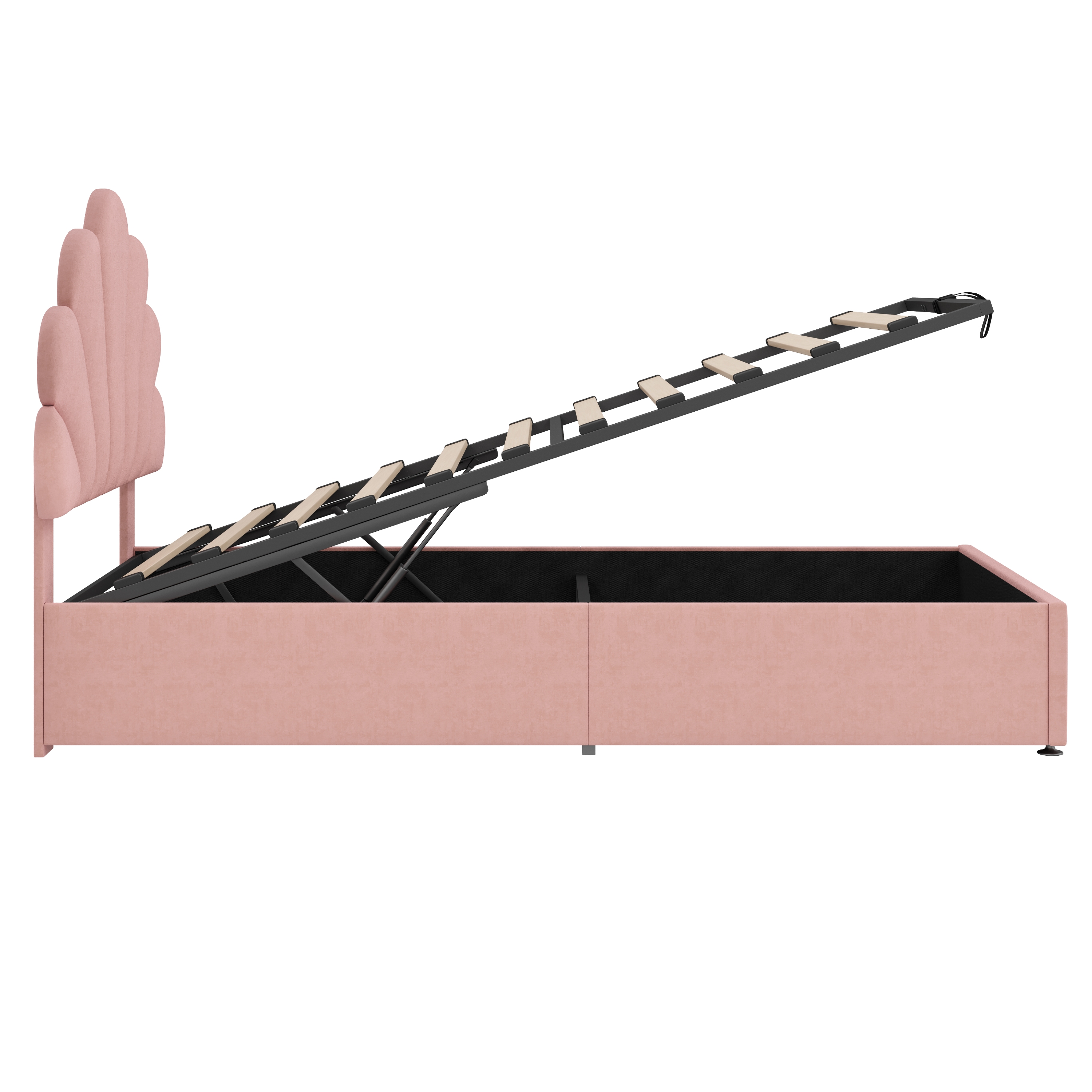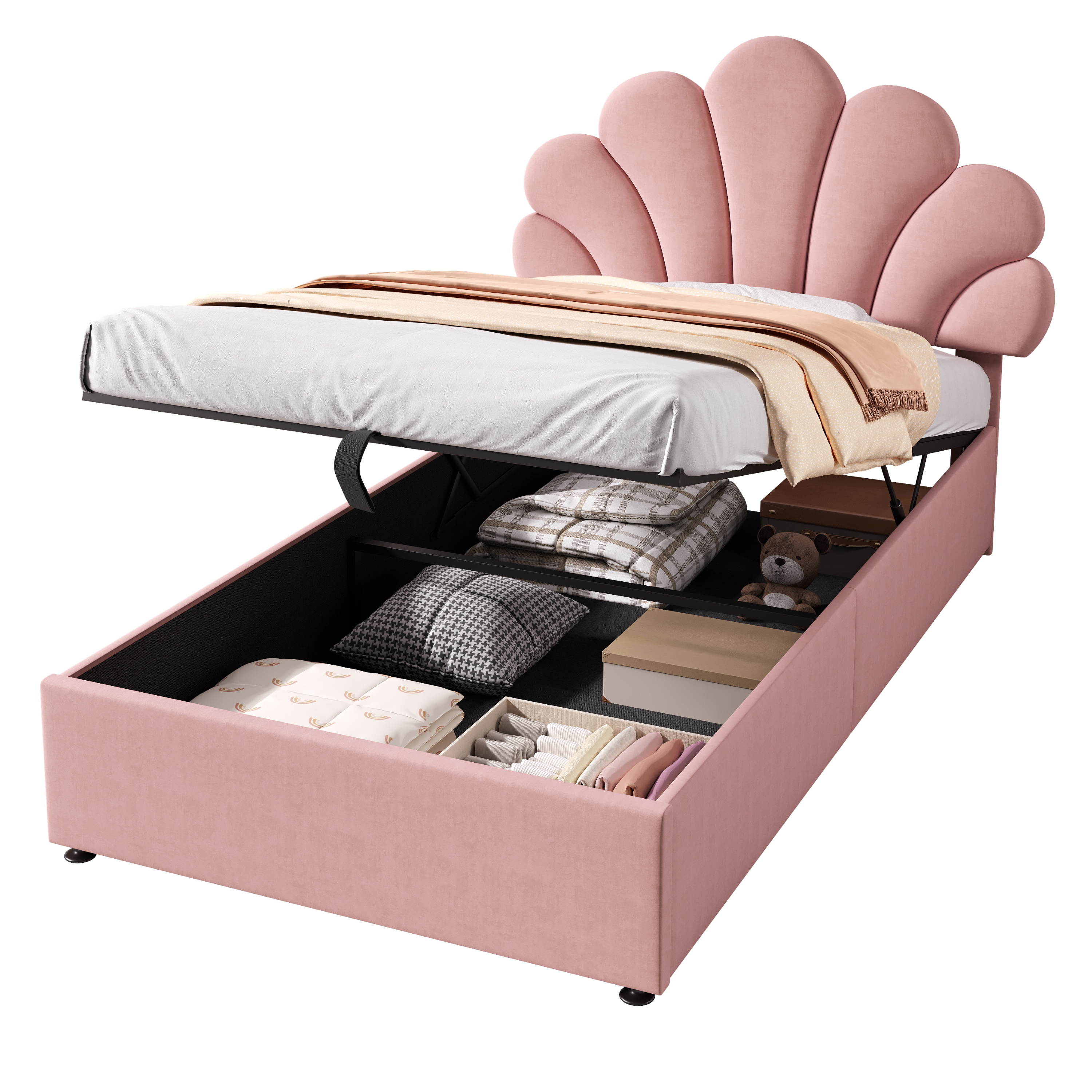 This velvet bed frame with adjustable chic petal headboard creates a versatile choice for mattresses of different thicknesses. . The premium hydraulic lift mechanism provides ample storage space under the bed. You can store blankets, pillows, bed linen or toys in the large storage box under the fold-up slatted frame. The headboard padded with high resilience sponge and covered soft velvet to give you better support when reading and relaxing. The bed frame is made of sturdy metal and wood construction which increases the stability and load-bearing capacity of the bed. In addition, this bed frame allows you to place a mattress directly, which not only saves money on purchasing box springs but also greatly simplifies installation. This is the IDEAL BED FOR ALL PRINCESSES! Special Features - Ample hydraulic storage space - Adjustable chic petal headboard - Soft velvet fabric - Sturdy Metal-Wood Support - Eye-catching appearance design - Easy assembly and care