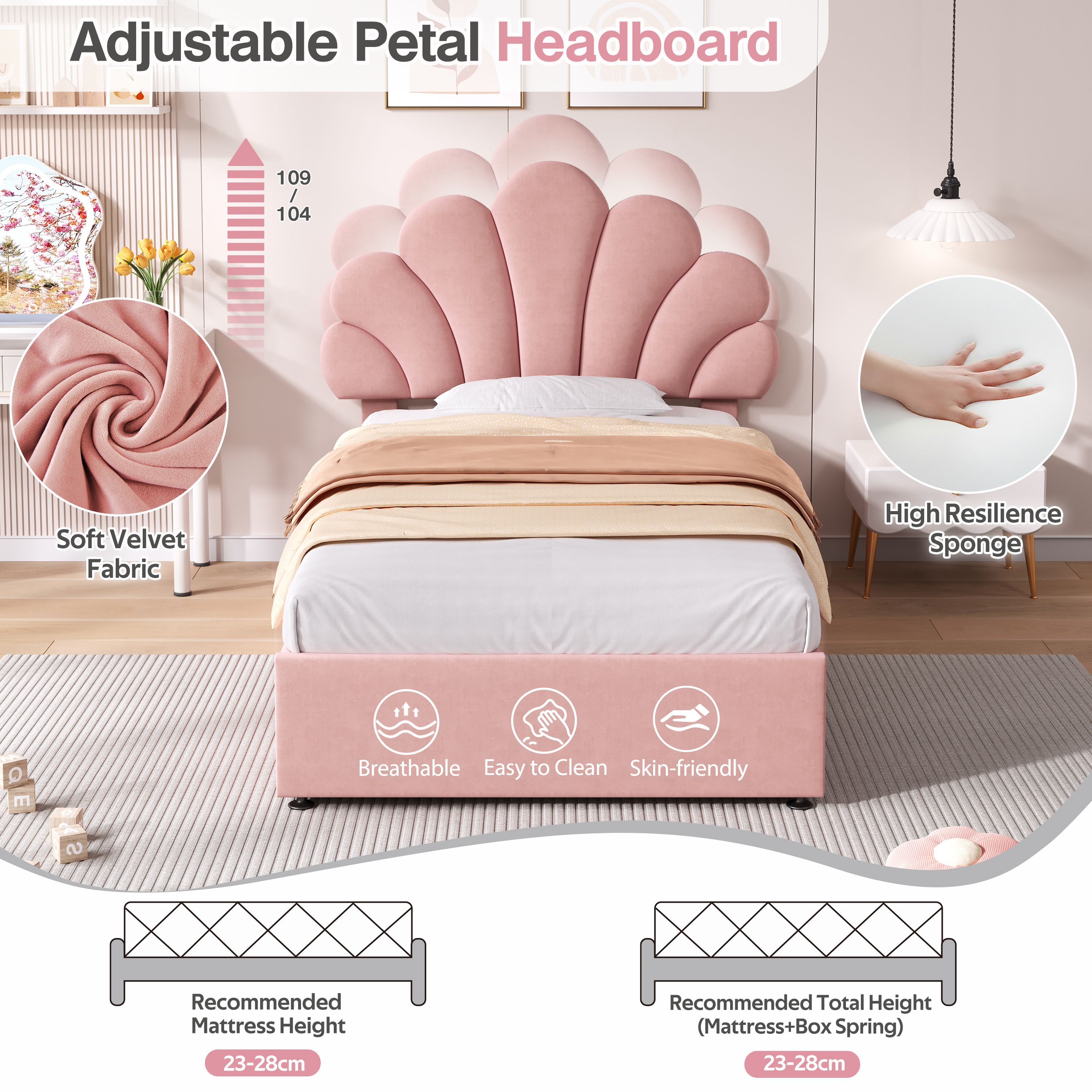 - [Eye-catching Design] With the design of a velvet petal pattern and adjustable headboard, this upholstered bed brings an artistic and warm atmosphere to your home. This bed provides a fun and adorable place for you to enjoy yourselves which makes you feel easy and comfortable.