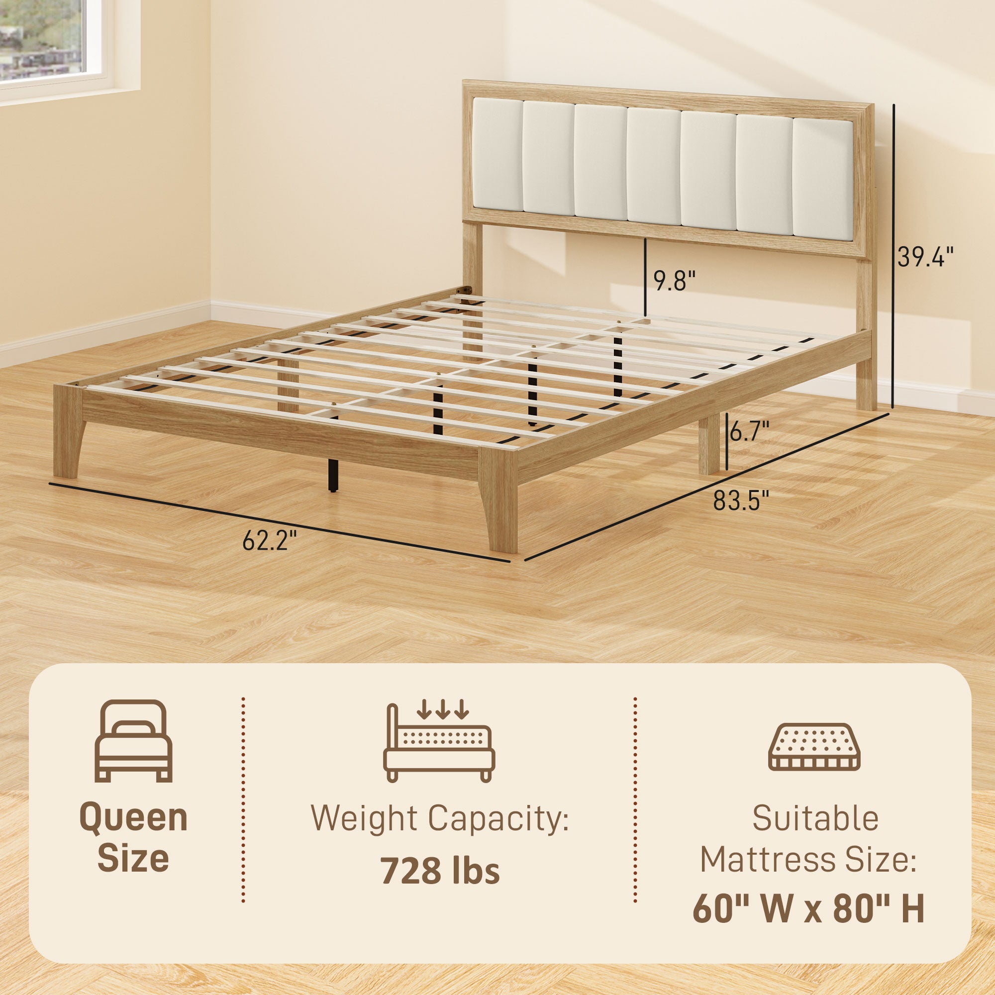 - - Queen Size Platform Bed Frame Information: Overall dimensions: 83.5" L x 62.2" W x 39.4" H. Suitable mattress size: 80" L x 60" W x 9.8" H