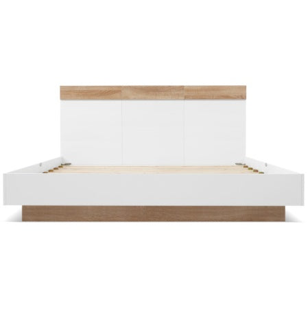 • Modernes Schwebebett: Großes Design zum kleinen Preis.Die Schlafstätte begeistert mit ihrer Schwebeoptik, die durch weit nach innen versetzte Quertraversen entsteht. Den finalen Schliff erhält das Bett durch die Wildeiche Absetzung am Kopfteil.Die freundliche Farbkombination aus alpinweißem Korpus und Absetzungen in heller Eiche Nachbildung bringen eine entspannte Atmosphäre in Ihr Schlafzimmer.