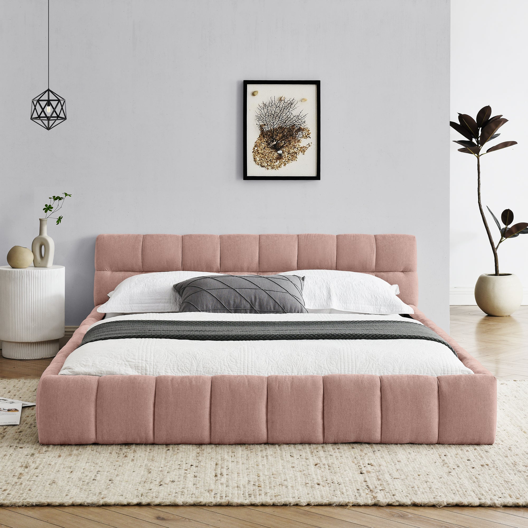 Product Name:Queen Size Upholstered Bed Frame with Thick Fabric, Chenille Fabric Grounded Queen Size Platform Bed with Headboard and Solid Frame. No Box Spring Needed, PINK(68''*86.5''*23.5'')